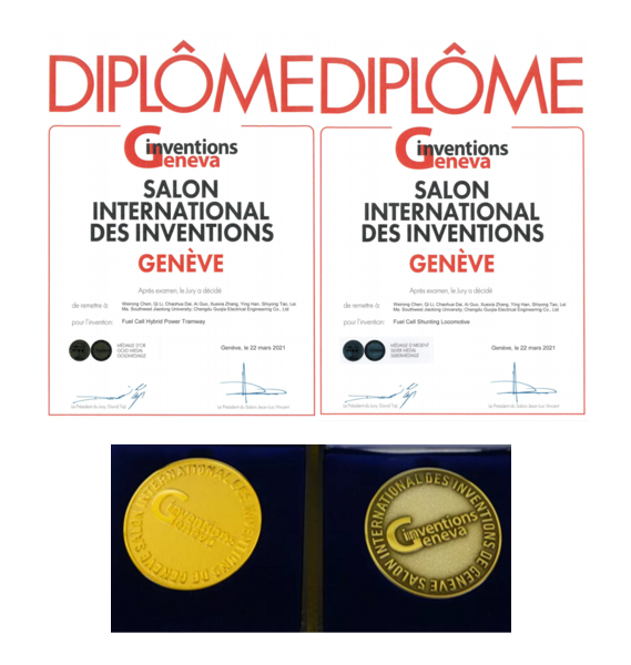 On the 48th International Exhibition of Inventions of Geneva in March 2021, the new energy team, led by Prof. Chen Weirong from Electrical Engineering School, carried away with two gold and two silver prizes, among which, "Fuel Cell Hybrid (FCH) Power Tramway" and "High Power and High Performance FCH Power System" captured the gold award, "Fuel Cell (FC) Shunting Locomotive" and " FCH Power System for Rail Traffic", the Silver Award.