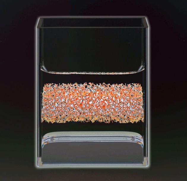 A room-temperature analogue of a molten-metal battery. The three liquids that constitute the positive electrode (bottom), the electrolyte (middle) and the negative electrode (top) stay separated like oil and vinegar.