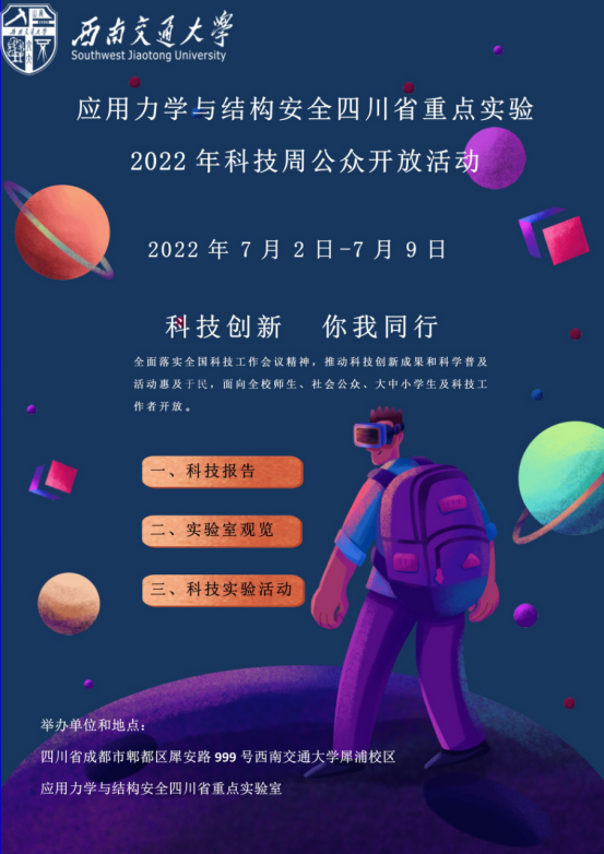 根据《四川省科学技术厅、中共四川省委宣传部、四川省科学技术协会关于举办2022年四川省科技活动周的通知》(川科奖[2022]3号)文件精神和要求,为全面落实全国科技工作会议精神,推动科技创新成果和科学普及活动惠及于民,英国上市公司365应用力学与结构安全四川省重点实验室结合自身特色和资源,面向全校师生和社会公众举办“科技创新,你我同行”主题的科技周公众开放活动。现将科技周公众开放活动安排相关事宜通知如下: