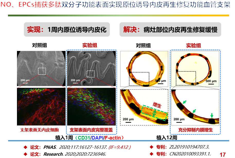 为进一步发展出具有对动脉粥样硬化病灶主动调控再生修复作用的新一代血管支架,基于内皮功能仿生理念,黄楠教授团队发展了具有原位催化患者体内内源性一氧化氮供体亚硝基硫醇(RSNO)释放一氧化氮(NO)功能的血管支架涂层新技术。基于该技术研制出的同时兼具抗血栓、特异选择性地抑制平滑肌细胞增殖和原位诱导内皮再生修复功能的血管支架,从而有望从根本上实现病灶血管再生修复,抑制支架再狭窄和晚期血栓等并发症的发生。“基于一氧化氮催化释放的内皮功能仿生血管支架涂层技术”已经实现技术转让,进入产业化工程和申报检验阶段。
