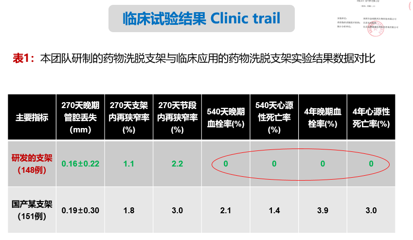 针对药物洗脱支架存在的系列并发症的国际难题,在国家“973”计划、“863”计划、国家自然科学基金等项目的资助下,黄楠教授团队持续开展新一代具有调控内膜增生和内皮再生修复的药物洗脱支架的研究工作。黄楠教授团队研发的血管支架相关技术转让给深圳金瑞凯利生物科技有限公司。5年临床研究表明,与国际血管支架的代表性产品,美国雅培公司血管支架Xience V相比,黄楠教授团队研发的血管支架五年并发症发生率和心源性死亡率下降到Xience V支架的1/20—1/68。黄楠教授团队研发的血管支架已经临床应用约19.2万例患者,实现从源头创新的基础研究到大规模临床应用。