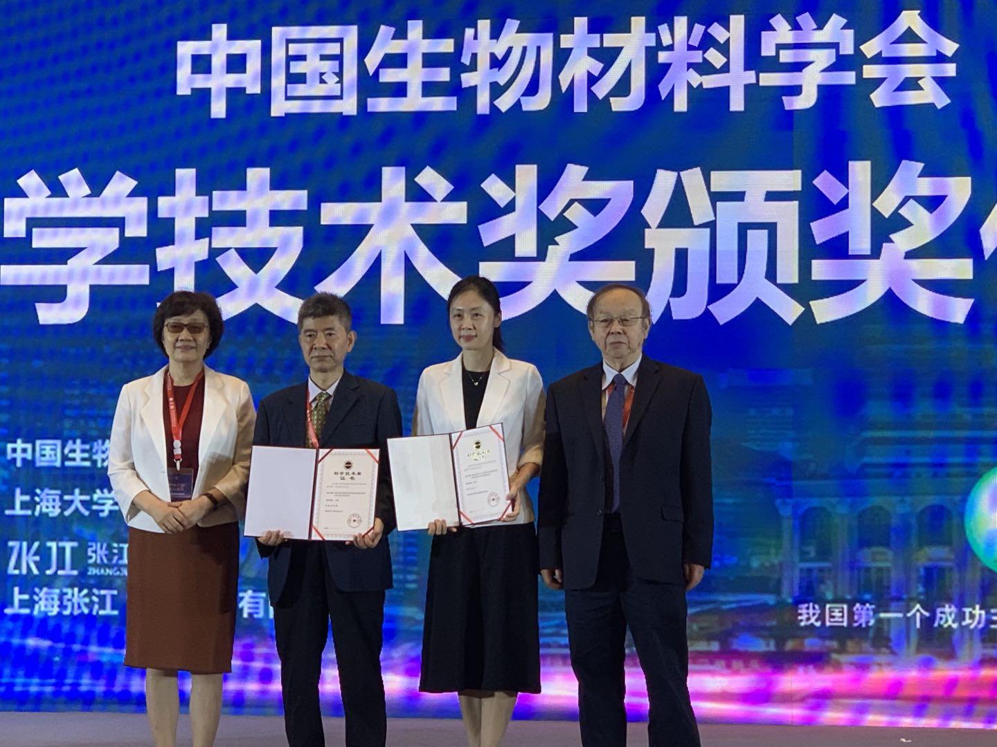 在10月12日大会开幕式上,颁发了2021年度中国生物材料学会科学技术奖(一、二、三等奖各2项)。我校黄楠教授主持完成的研究成果——“具有调控内膜增生和内皮再生修复功能的血管支架及临床应用”获得中国生物材料学会科学技术奖一等奖,张兴栋院士和王迎军院士向黄楠教授颁奖。