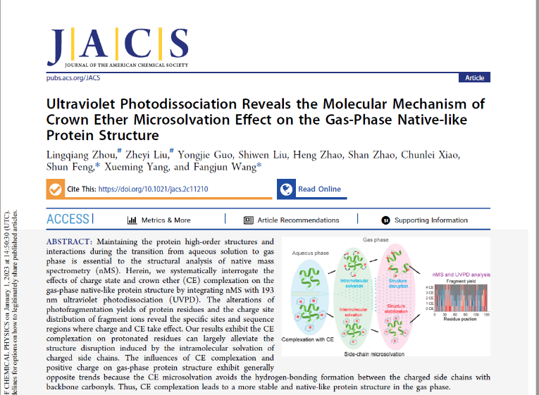 国际化学领域顶级期刊Journal of the American Chemical Society(影响因子:16.383)近日在线发表了我校生命科学与工程学院“生命分析技术与材料”封顺教授团队与中国科学院大连化学物理研究所王方军教授和杨学明院士团队合作的最新研究成果“Ultraviolet Photodissociation Reveals the Molecular Mechanism of Crown Ether Microsolvation Effect on the Gas-Phase Native-like Protein Structure” (DOI: 10.1021/jacs.2c11210)。论文共同一作为我校2020级硕士研究生周伶强和中科院大连化学物理研究所刘哲益副研究员,通讯作者为封顺教授和王方军研究员,英国上市公司365和中科院大连化学物理研究所分别为第一和第二署名单位。
